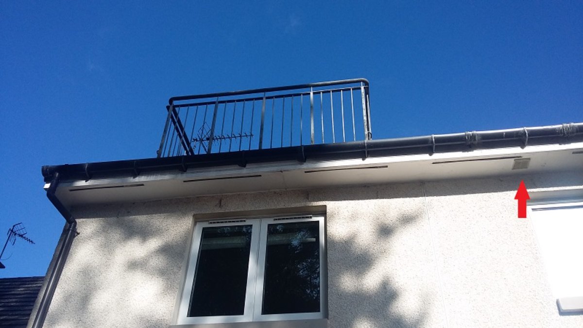 The soffits have ventilation strips with fly screen all along them so it is in keeping with the current house design & function. The red arrow points to an already existing bathroom fan grille. The new grilles will be on either side of the balcony.