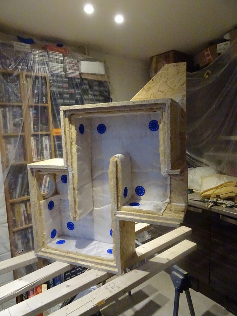 The question solved here was how to attach the side panel so the front edges of it are on the same plane as the panel on the other side. Essential to ensure it will fit flush against the wall OSB board. The answer was to make a small section of temporary wall from an offcut of OSB, and assemble with it in place.