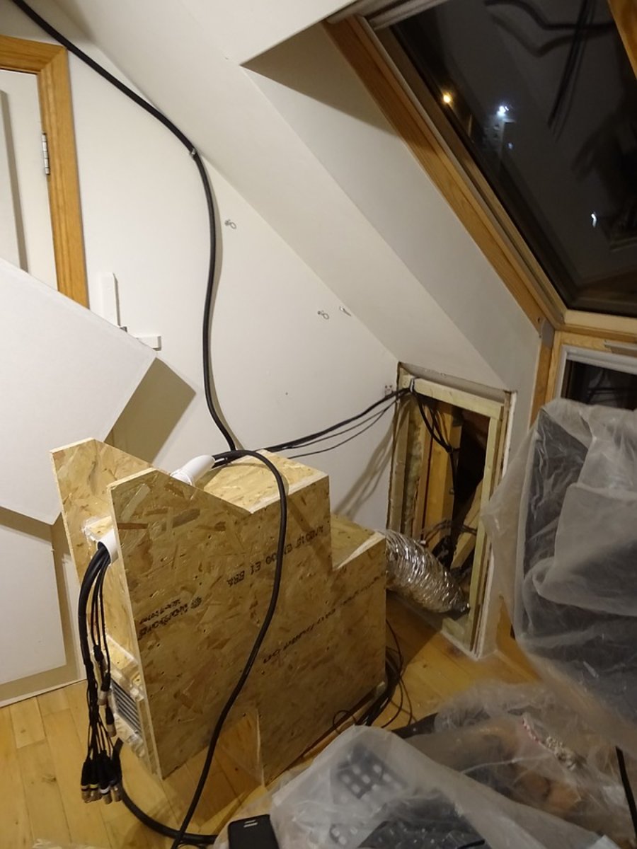 I took a day off on Saturday for R&R. Sunday I finished the plasterboard on the rear knee wall. It now has one layer of 18mm OSB and one layer of 15mm acoustic plasterboard all over. Green Glue between them.