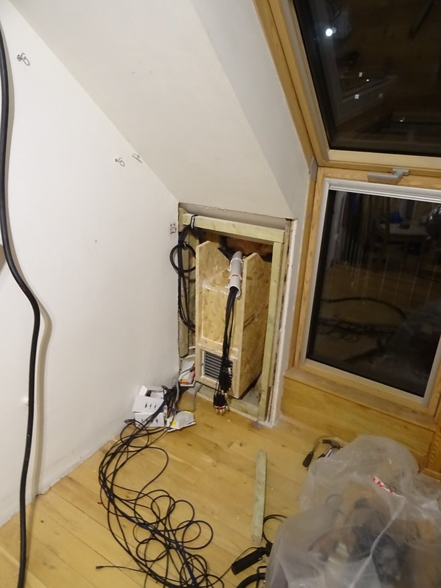 Spent the morning crawling about the roof eaves verifying the planned duct runs were realistic. Decided to go for a longer route of flex duct with very gradual turns rather than a shorter route with sharp turns. Did some tidying up in there, and used the circular saw to trim back the tongue and groove floor around the front knee walls to allow for a double layer of OSB + plasterboard. Previously there was just plasterboard. Also did several other small but necessary jobs preparing to fit the silencer.