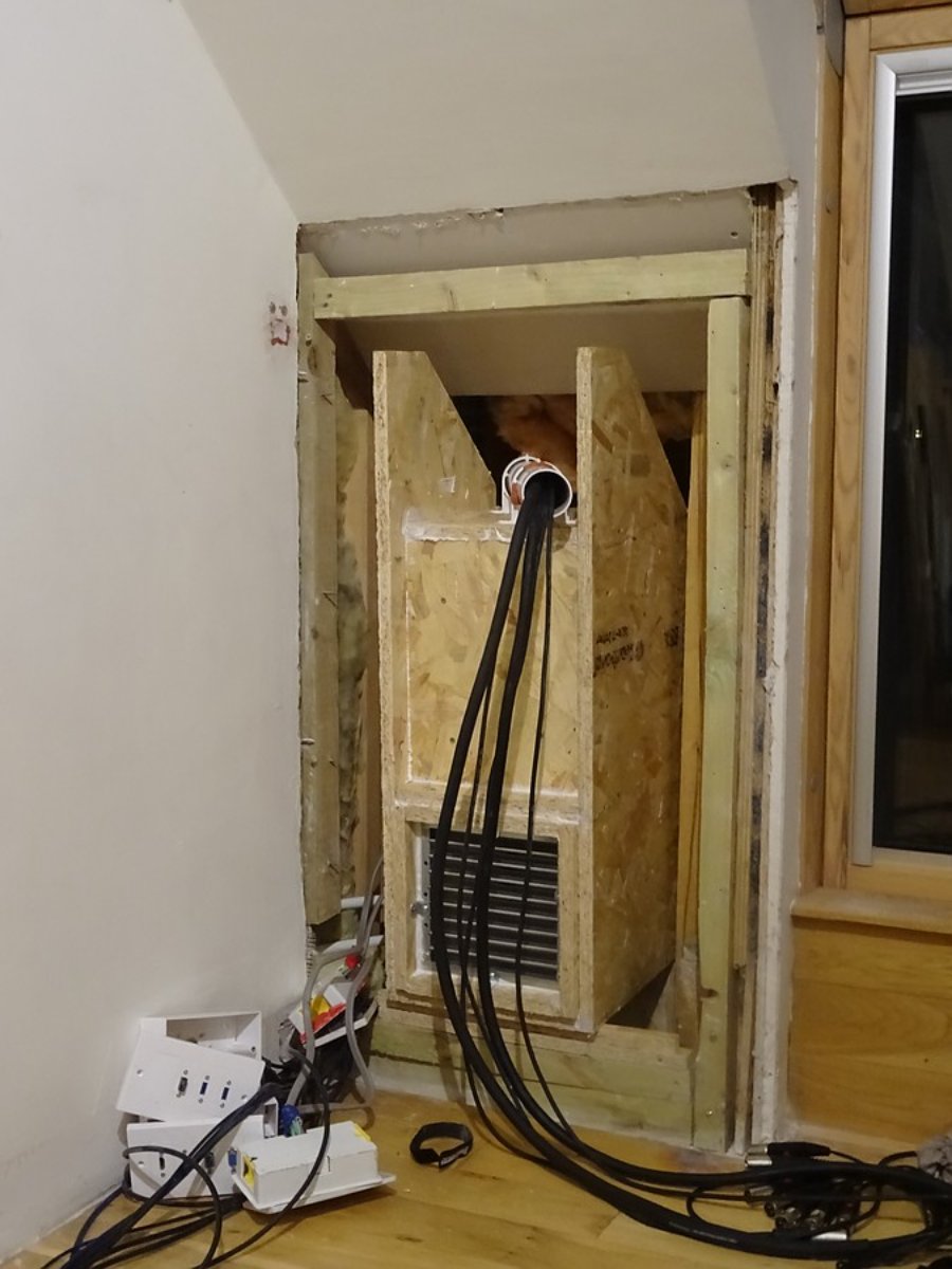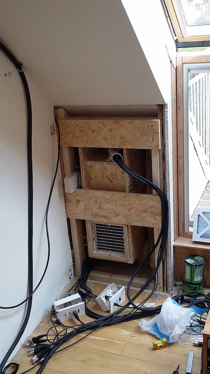 The intumescent grill that faces in to the room has to be attached in a very specific manner to preserve the fire rating. Brackets and screws of particular dimensions and type were detailed in the fitting instructions. The gap surrounding it must be filled with intumescent sealant. This grille is 200x200mm, not large enough to get the airspeed to under 300 feet per minute at 6 air changes per hour. No matter though, it is only a way to get air through the wall, there will eventually be a larger register here as part of the soffit.