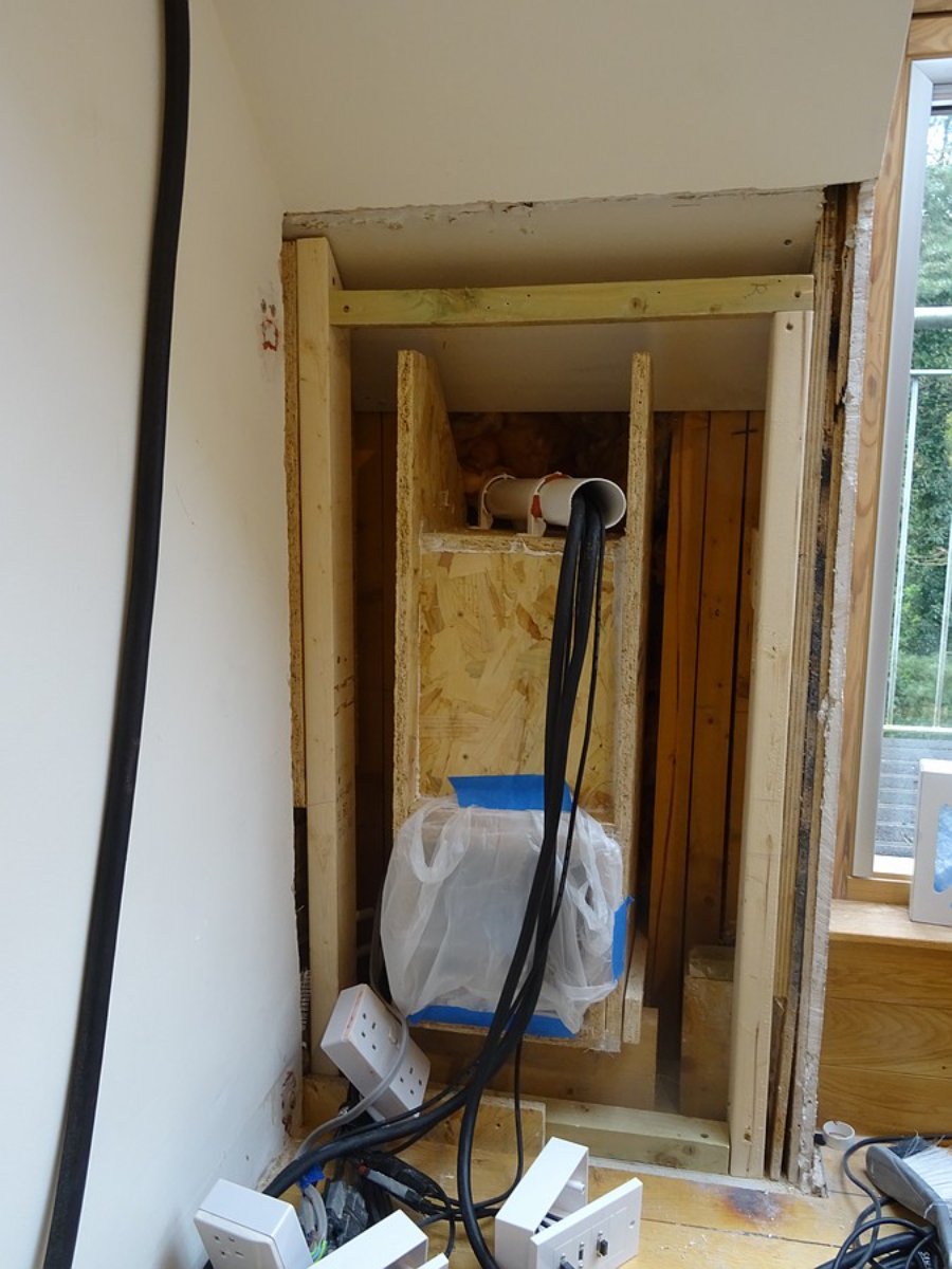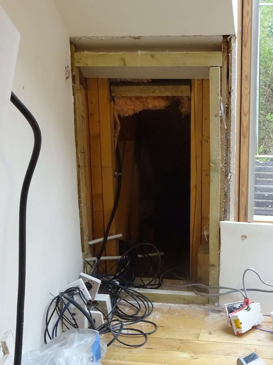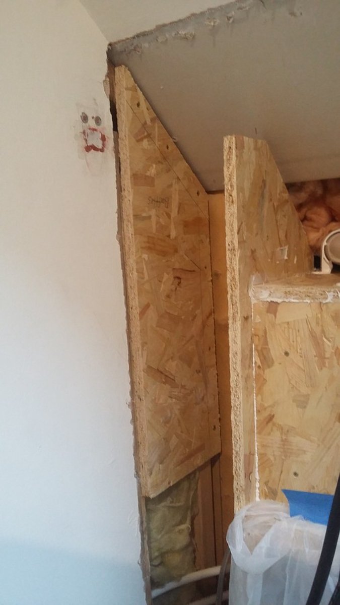 Yesterday (Monday) I spent beefing up the studs forming the left knee wall with methods inspired by those Stuart uses for hanging heavy doors. This is where the exhaust silencer goes. Although constructed correctly and fine for a small bit of plasterboard, the existing stud wall was too weak for the silencer. The vertical stud on the left of these photos was only 20x50mm cross section. All studs were nailed and a bit wibbly wobbly.