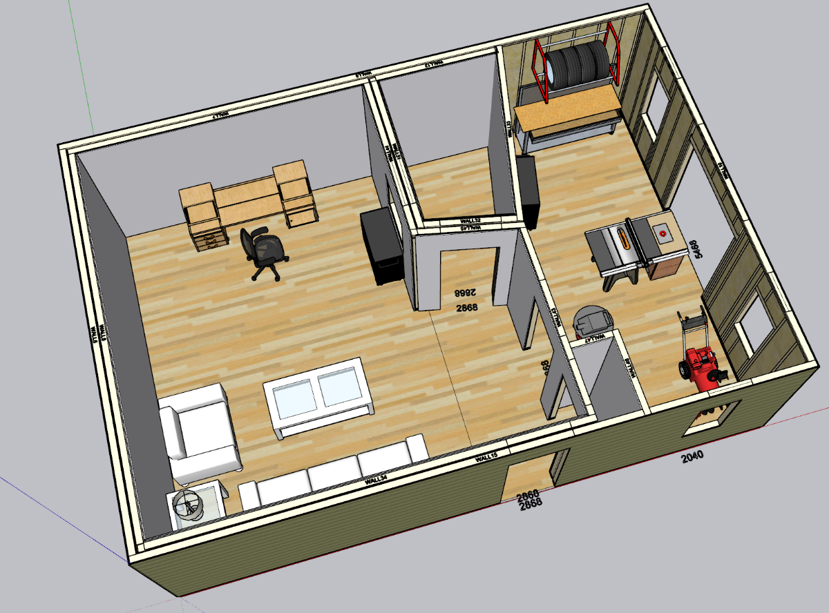 Here is a new design for my studio that I am starting to like. Major changes include adding a workshop to keep my tools, and other garage type things. Doing away with a big live room and investing almost all the space in single room studio with small iso booth. The booth would be for vocals, guitar cabs etc... should I do drums, I would just do it in the control room.
