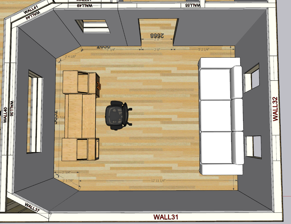 gullfo wrote:Source of the post one note - on the last image - the solid angled walls on either side of the desk - you would get more bang for the buck by making those straight so you can use those corners for trapping or later as part of a soffit mounted speaker system. it would require moving the door into the live room.