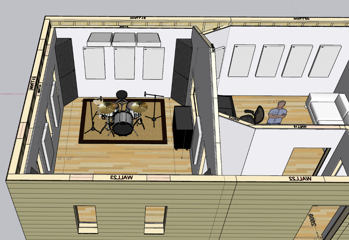 I break ground before the fall, will start a build thread! Thanks for all the help so far. The treatment in these sketchups isnt final. I plan to do a 2 foot deep inside out wall at the rear of the studio that will be a massive bass trap. The front walls by the window into the live room will also be inside out walls with slat resonators. The small iso booth will be fully inside out as well. there will be glass doors between the live room, the air lock, and the control room. This will act as a make shift iso booth so bandmates can see each other if we need some isolation. Otherwise I am super excited to start building! I have a nice HVAC ducted minisplit system going in with a dedicated air changer. Cant wait to get building!
