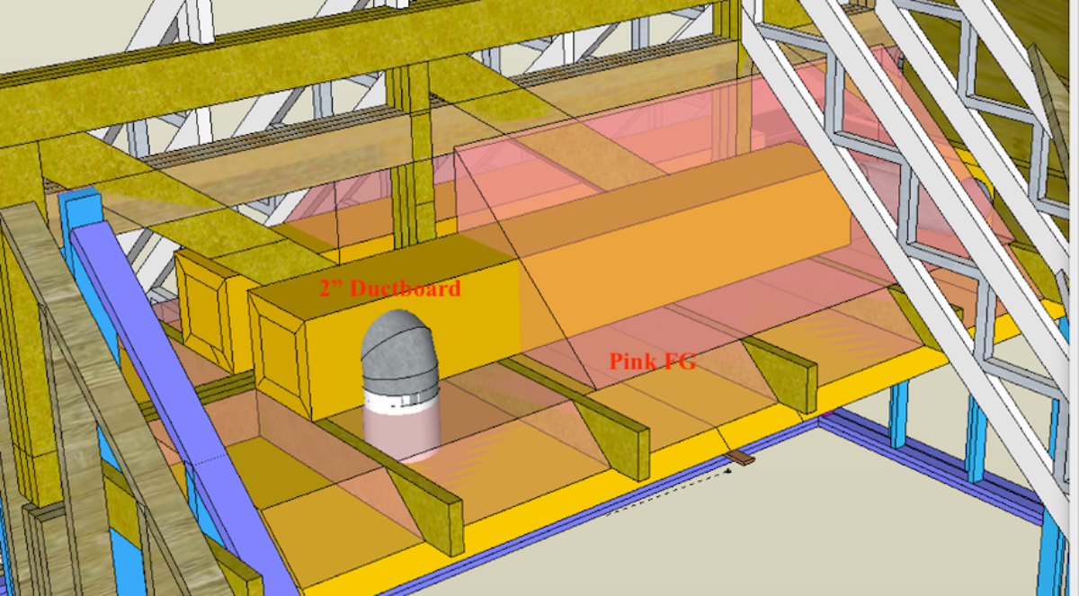 I will be making two supply paths at either side of the ridge beam to further reduce air velocity and for symmetrical finishes. As for finishes, below the collar ties, I plan on exposing the coated side of the 2" duct board. The Owens Corning duct board I will be using has similar acoustic characteristics as 2" 703. Above the duct board the space between the collar ties will be filled with pink FG batts.