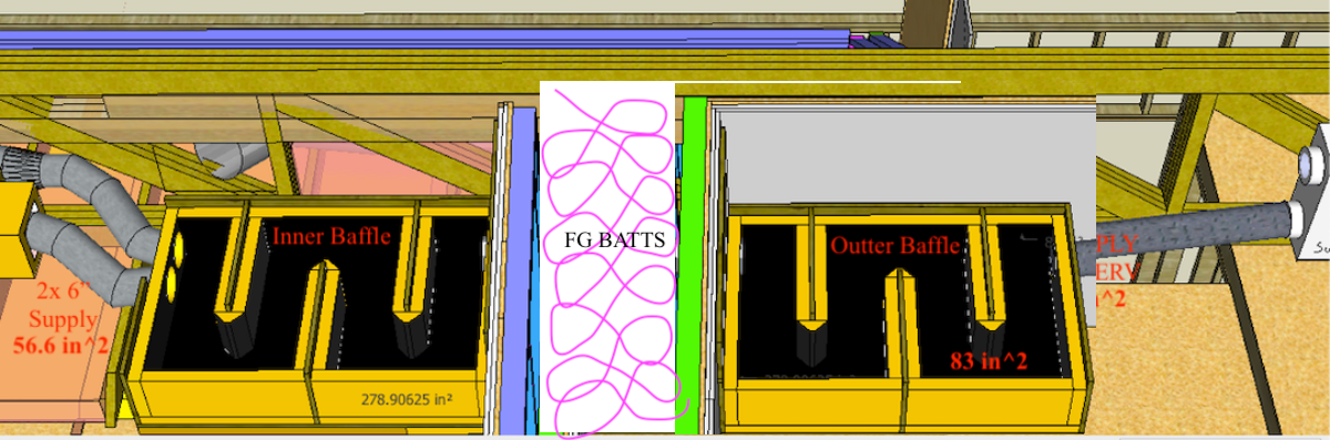Here is the 2nd draft of my baffle boxes and ducts. Baffles built with 3/4" birch plywood and 2" Duct board. I'll be working mostly alone so I'll run my Panasonic Intellibalance FV-10VEC2 ERV at 50CFM (low setting) most times. The ERV has 6" ins and outs so I will use 6" flexible ducts between the ERV and outer leaf baffles boxes.