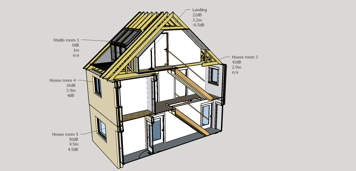 The relatively poor performance of House room 5 is almost certainly due to sound from the landing going down the stair well, through the poor STC glass doors and into the room.