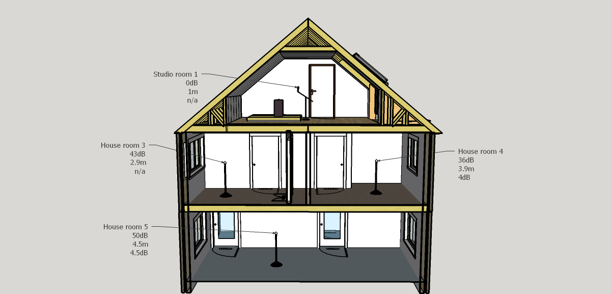 I performed sound transmission level tests before and after the improvements. The signal was sent through a bass amp in studio room 1 and measured in each room with a UMIK-1 calibrated measurement mic and REW. For rooms adjacent to studio room 1 (rooms 3, 4 and the landing) precise positions of amp and mic were noted and recreated for before and after tests. Mic positions in other rooms were recreated from photos.