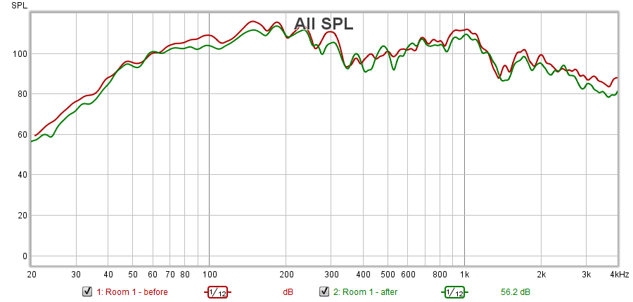 I can already hear the difference with that and all the other improvements with just my ears. In terms of the absence of sound, I thought the room was pretty quiet before, but now it is very quiet. Almost as if a bunch of sound you wouldn't be consciously aware of unless it stops is no longer there. The effect is strong enough to give the room a different (better) ambience. This has actually taken me by surprise, and I like it a lot. The loudest thing in the room now is unquestionably the noise coming through the windows, even with the vents shut. And only because everything else is so quiet. It's actually quite reassuring to know we've reached the limits of the room in that respect.