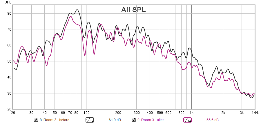 Next take the measurement mic to room 3 and repeat the sweep with the amp directly on the floor. The amp was directly on the floor for the "before" tests too. Here are the before and after sound isolation improvement measurements;
