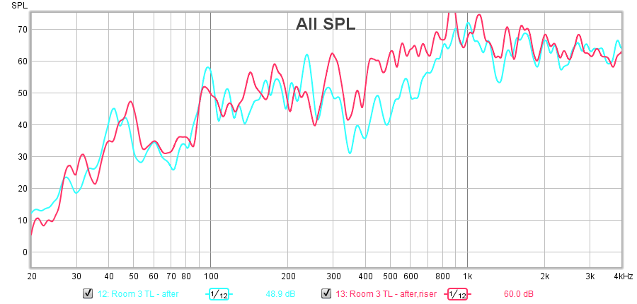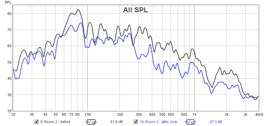 As per my riser post, I've finished the 8x6 foot modular riser and initial sound isolation improvements. I did before and after measurements and am preparing a post about these.