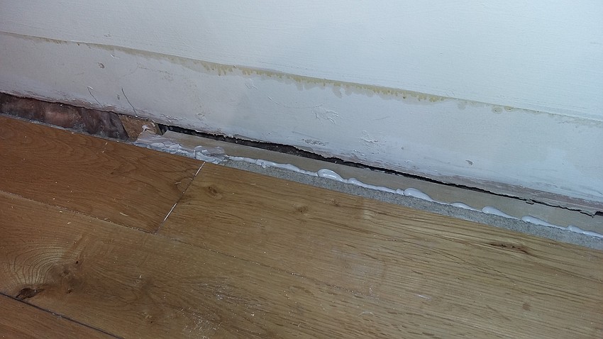 The cut down top board sections used to reach the wall were happily not glued to the sub floor and so easily removed. The rest of the top boards were glued. They are decent tongue and groove system, so with that and the glue should be fairly well sealed.