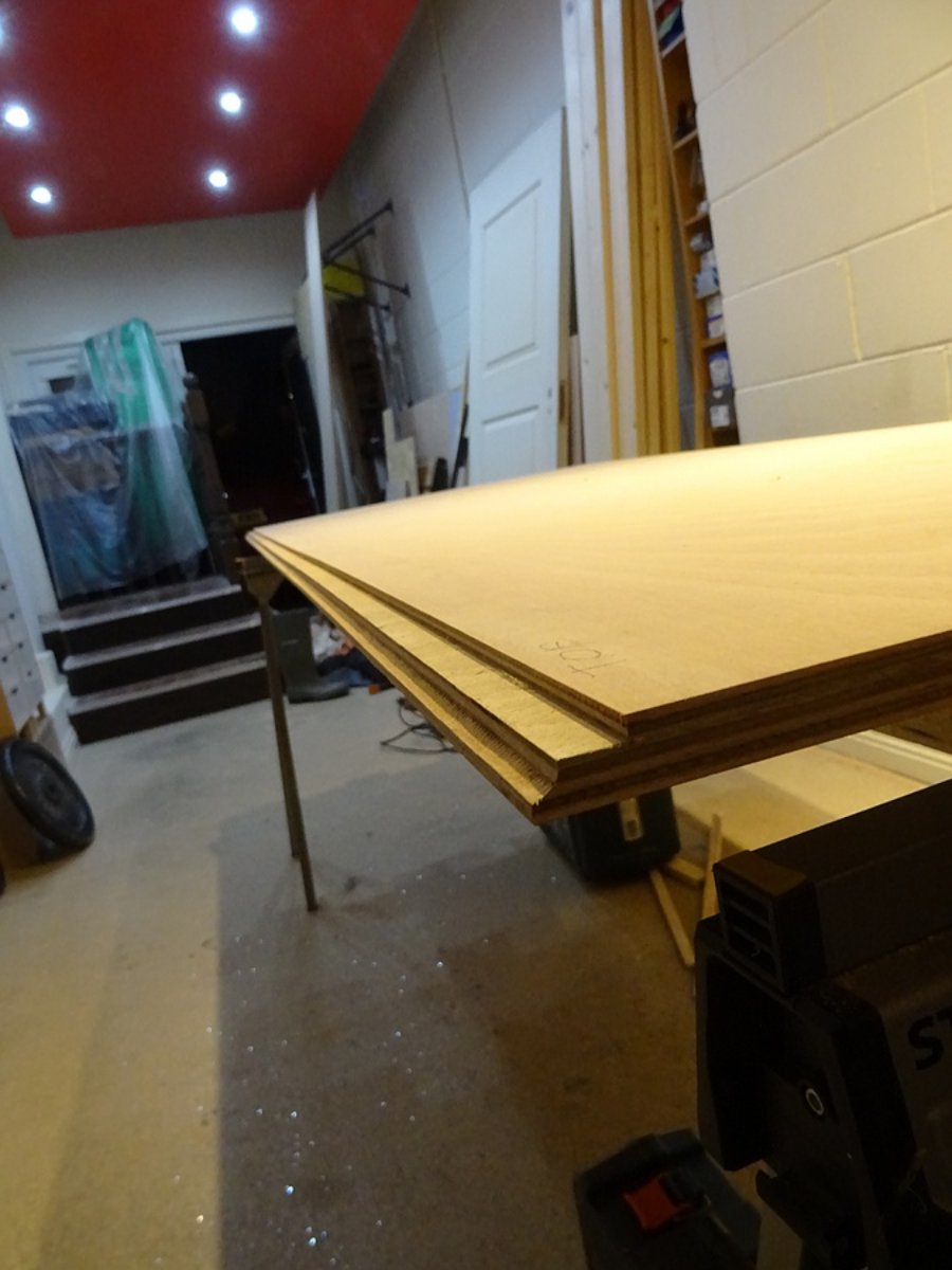 I've cut the new door face from 18mm hardwood ply, it will add about 12 kg/m2 to the door. I had to cut a fancy profile along the hinge edge to stop it fouling on the door architrave when opened wide.