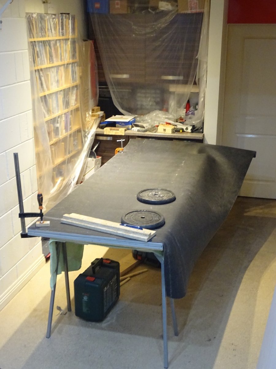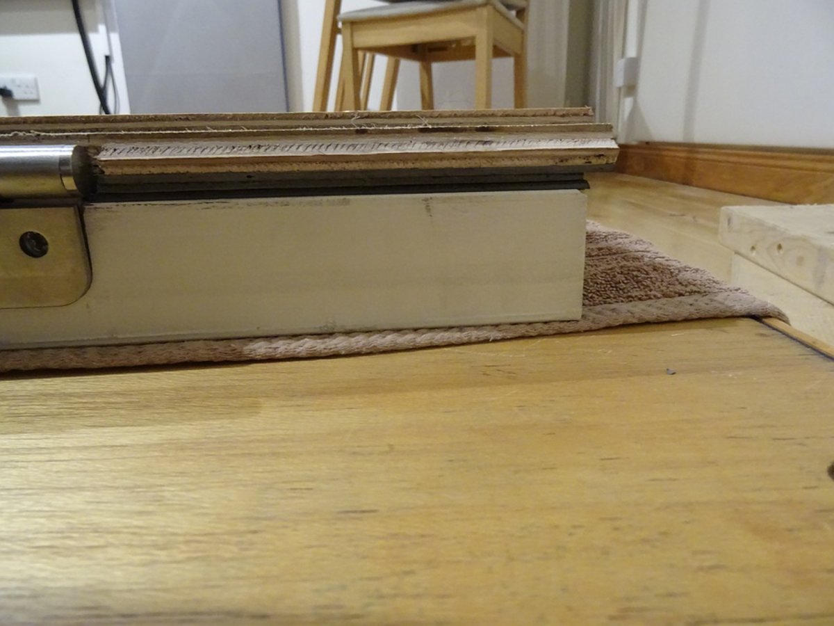 Then I put the (now much heavier) door face on top of this lot. The wooden props let me position it in place without disturbing the panel fixing assembly.