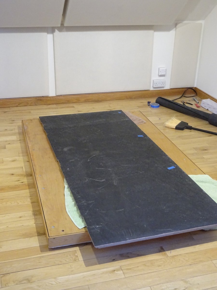 Cutting mass loaded vinyl to fit the door. There will be three layers of this, giving a total addition of 15 kg/m2.