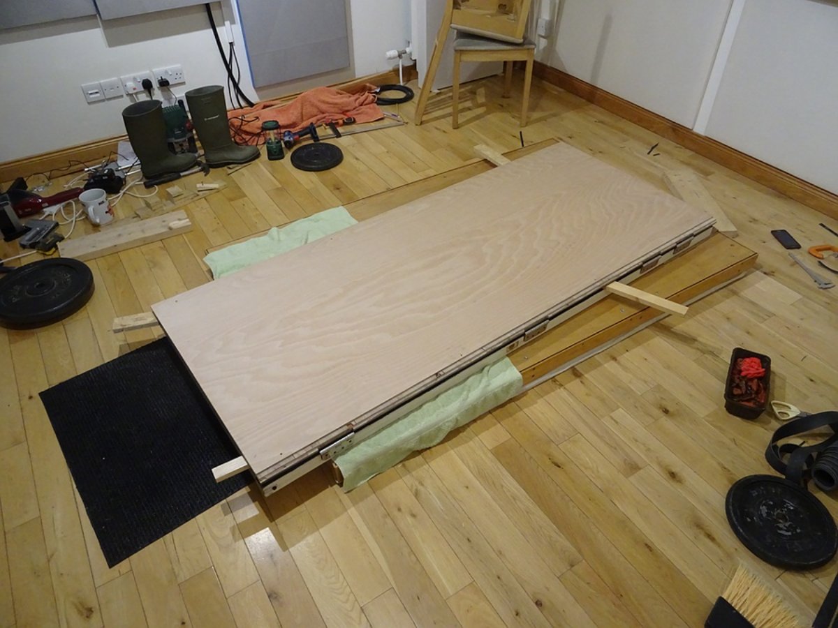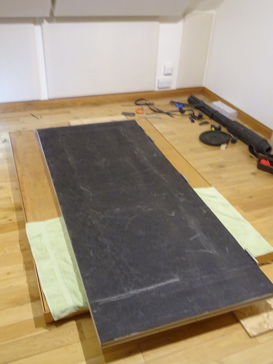 I did it by pulling the green towel forward a foot or so to prevent the door scratching the floor. Then moved 40kg of weight plates on a rubber mat in front of the riser to provide a pivot for the bottom of the door to butt against when I lifted it. Then I grabbed the other end of the door (at the back of the room) and lifted it against the pivot until vertical, then slid it along on the towel to the door frame. Once there, I pushed a wedge under the door to ensure the hinges were aligned with their screw holes in the door frame. Screwed the top hinge into place, and from there on it was easy.