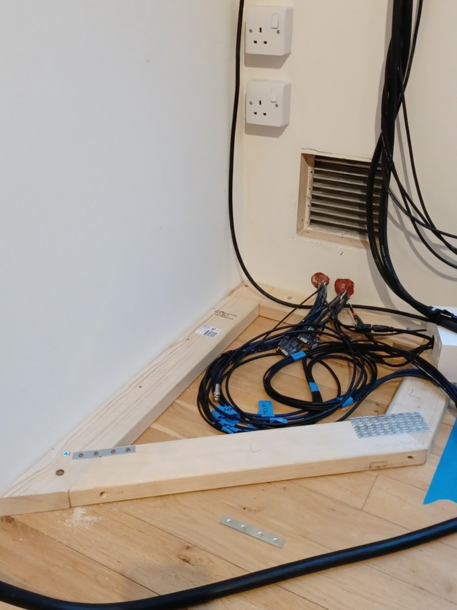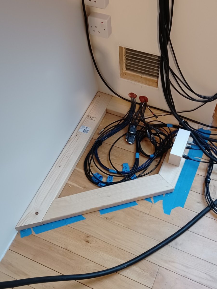I cut the sole plate for the soffit structure this morning before a session. First I measured and marked the dimensions onto masking tape on the floor, then cut the stud wood to size. Working out the correct angles to mitre the baffle face corners was a bit of a puzzle, but I got there in the end!