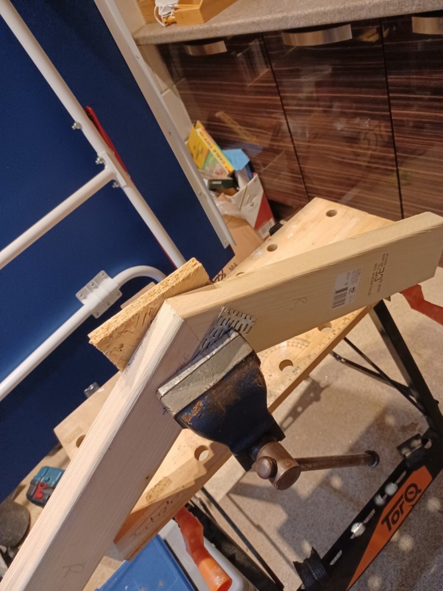 Pushing these tooth plates into place was some task. I had to do it bit by bit in the vice. Nail plates would have been a better choice. I initially planned to use these on all joins, but the mallet just bounced off them when I tried. Using screws and standard brackets was easy enough though once the angled part and plates next to the walls were in place. I'll probably beef up all those joins when more of the structure is assembled.