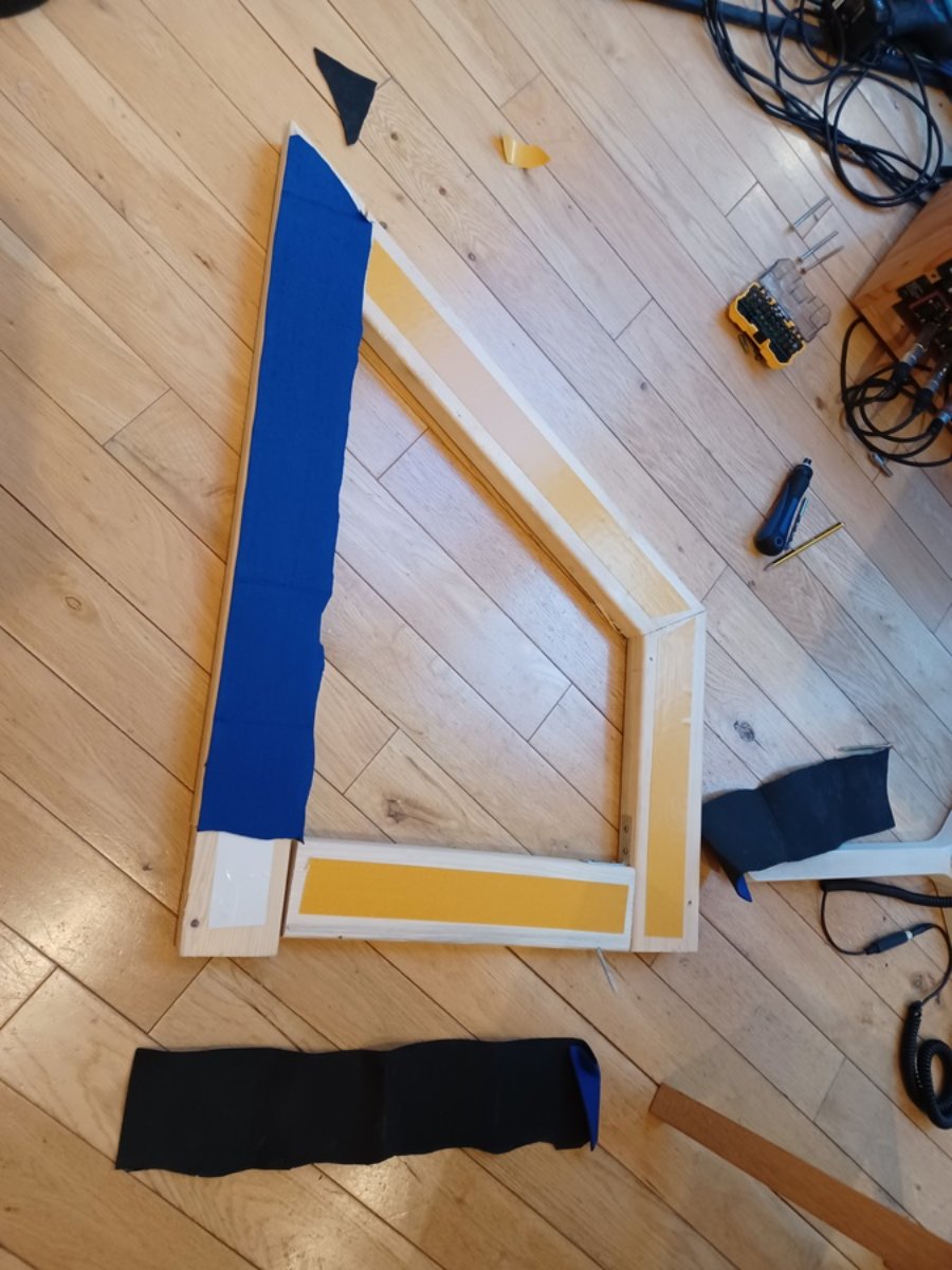 Spacers for the attachment bolts to the rear of the speakers. 18mm OSB + 2 MLV "washers". Once I know everything is properly placed I'll screw these into place so they don't rattle about or roll away when removing the speaker.