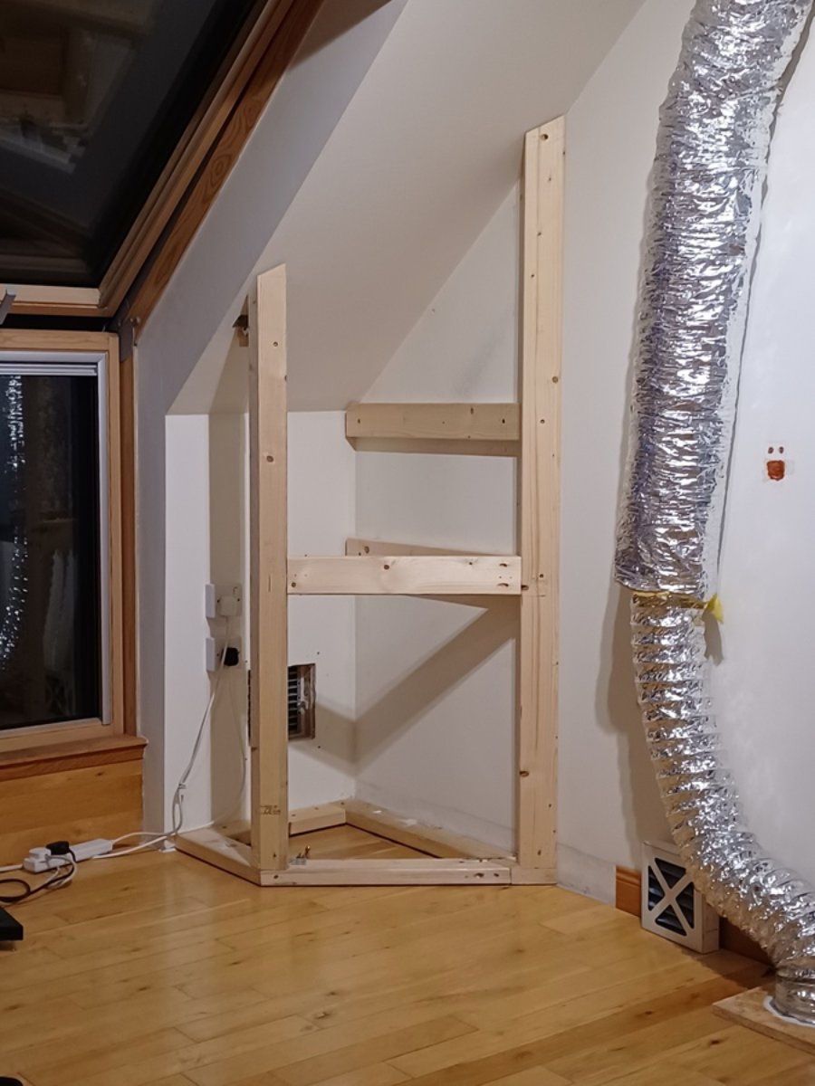 The rightmost vertical upright didn't need a sway brace as it could be attached to an existing non-load bearing stud wall. I left a small gap at the top just in case.