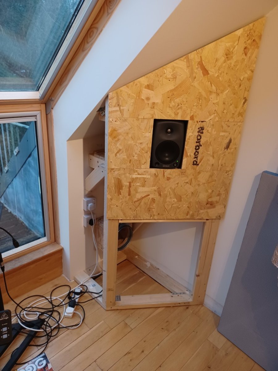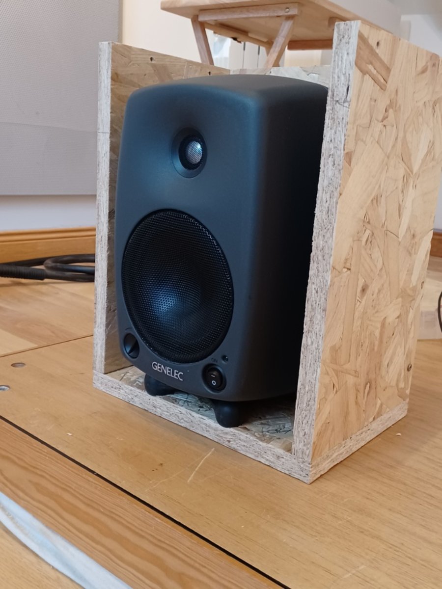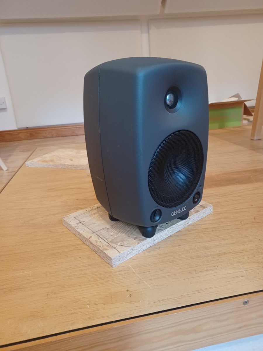 As the Genelec speaker isopods give some benefit in reducing the transmission of low mid frequencies to the structure they are mounted on, I decided against bolting the speakers to their shelves. I had them on the isopods before, and it was ok then, so if it ain't broke, don't fix it.