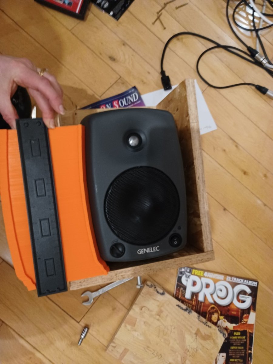 Test fit - it works! It gives substantial resistance to horizontal movement imposed from outside the speaker.