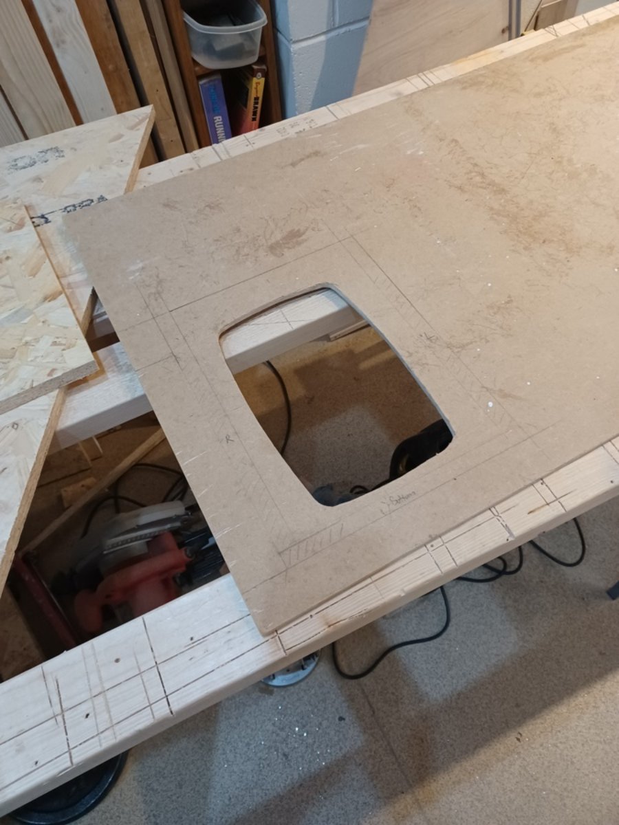 The test baffle has a rectangular hole for the speaker, but the speaker is egg shaped, so this won't do. I built an MDF router template for cutting speaker shaped holes in the final MDF baffle faces. It's sized and shaped to give a few mm clearance around the speaker so the baffle face won't touch it at all. Quite an involved process! First, use a contour tracing tool to trace one edge of the speaker onto the MDF board.