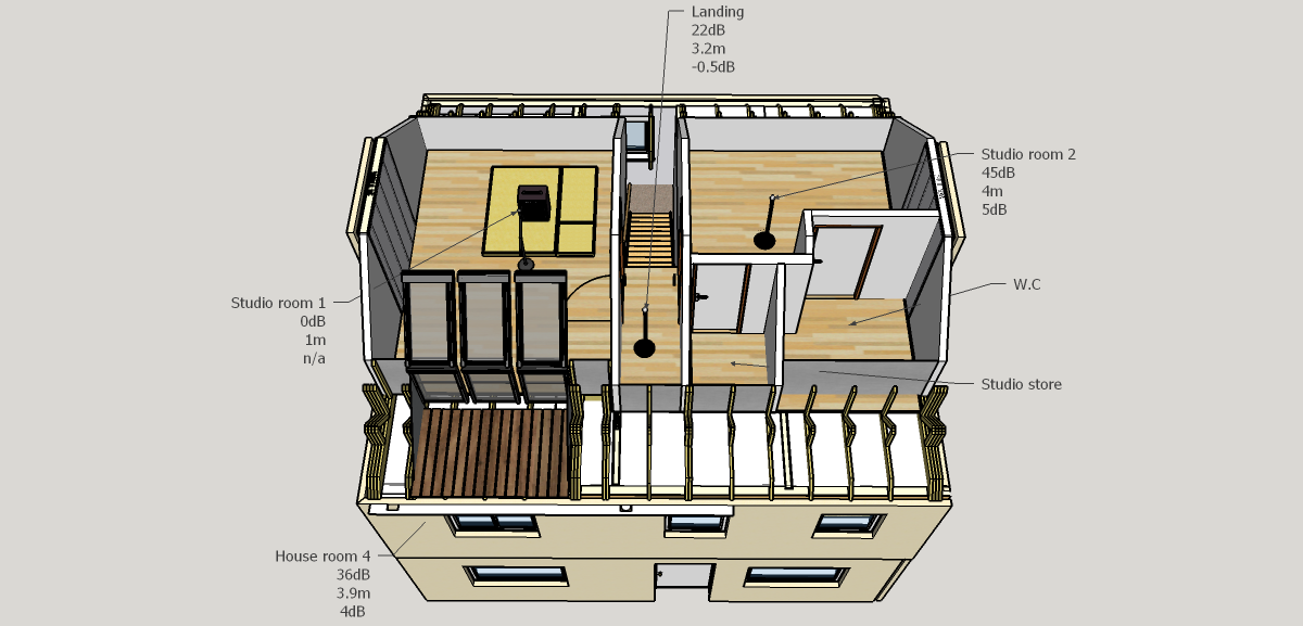 As the landing leads to the stairwell and most other rooms in the house it would seem likely that improving the transmission loss from room 1 to there would generate significant gains in most other rooms too. I have some ideas about improving this, more to follow in the next post.
