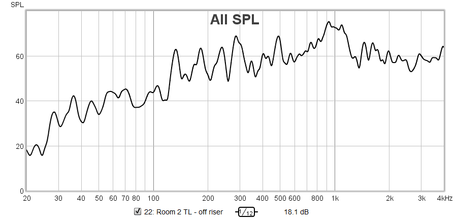 The landing is a disaster in terms of sound transmission from room 1;In particular look at these holes in the TL curve at 31 and 49Hz. The wall might as well not be there at these frequencies! I wonder if the door and/or the glass bricks in that wall might be part of this problem;