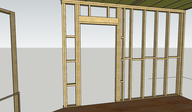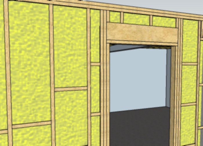 The final part of that, is to then use OSB or plywood as the first layer of sheathing on that part of the wall, then put the drywall over that for the final layer: both OSB and plywood are very good with sheer loading, so the add extra structural integrity, strength and rigidity to the whole "sandwich" of stuff that is holding up the door, and keeping it straight and true.