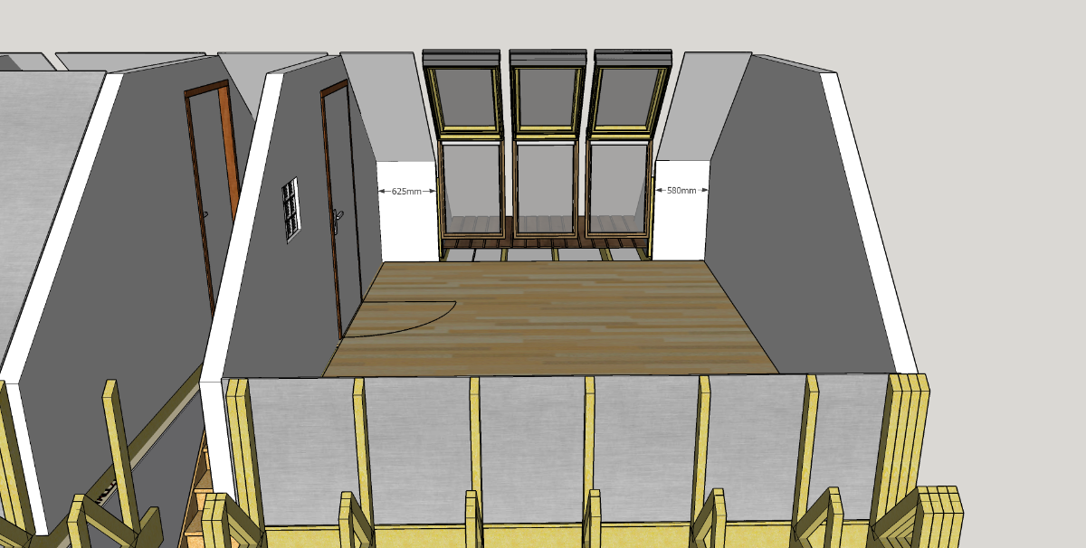 - The short walls from room 1 to the eaves are 12.5mm plasterboard, but presumably the large cavity (now with more insulation) between that and the equivalent short walls on the landing and other rooms helps with sound attenuation.