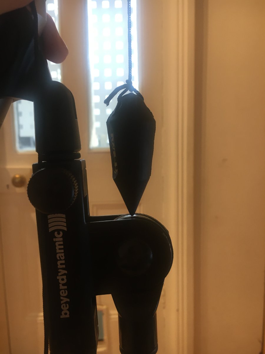For the mic position, instead of hanging a plumb bob all the way to the floor, I used it to align the tip of the microphone with the stem of the stand. This way the mic is always at the same angle (around 70°)