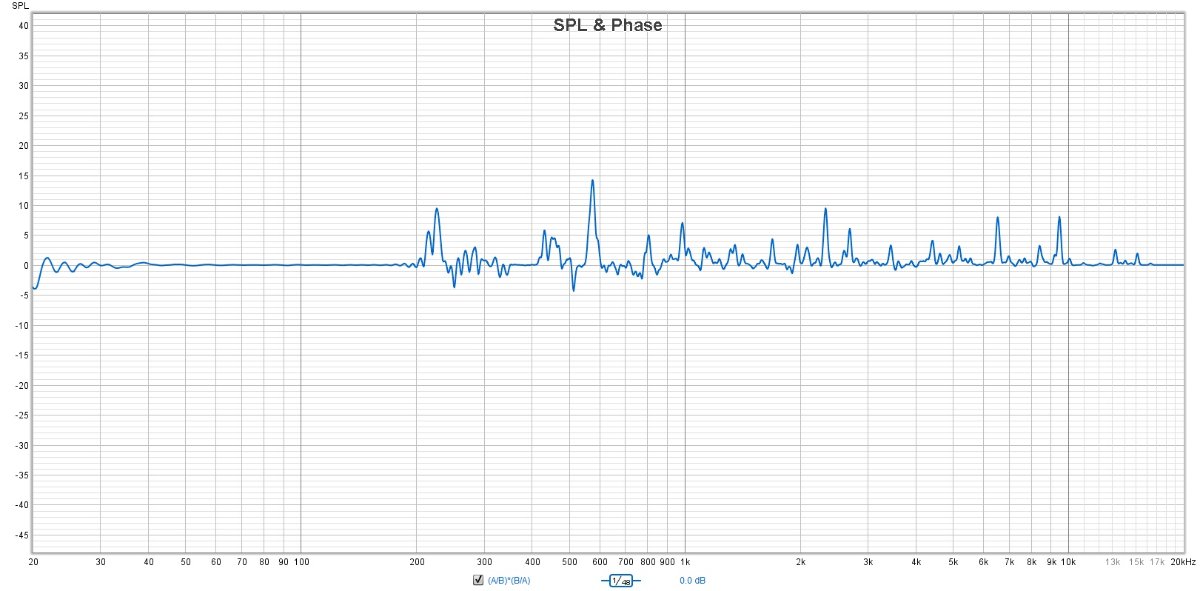 If REW were working properly (A/B) would cancel out (B/A) and this resulting line would be completely flat at 0dB, but from around 200Hz upwards it starts spiking.