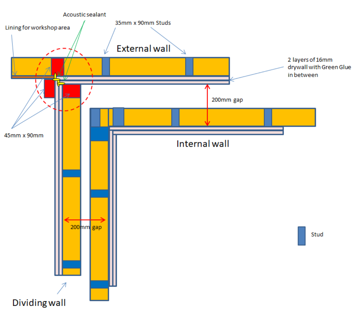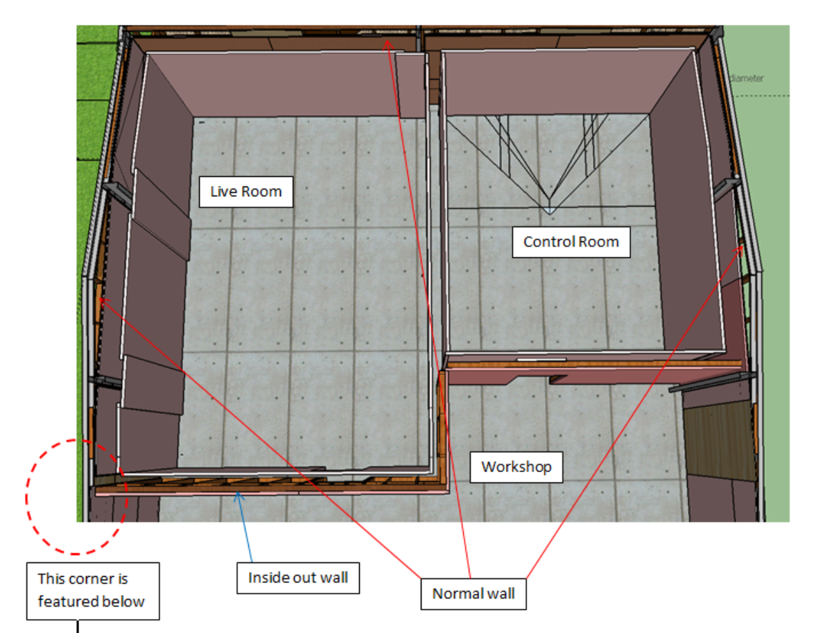 My outer room wall structure is a mix of "normal" and "inside out". It is normal where the outer wall is part of the external structure but I want the internal wall that divides my studio from my workshop to be inside out - simply because it maximises use of space. That makes for an slightly unusual corner structure where the normal meets the inside out. I'm just wanting to get some input on my approach to the join.