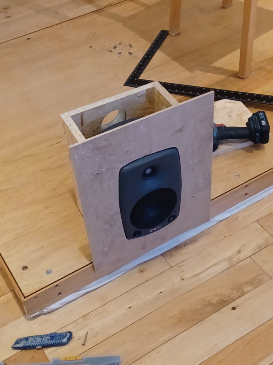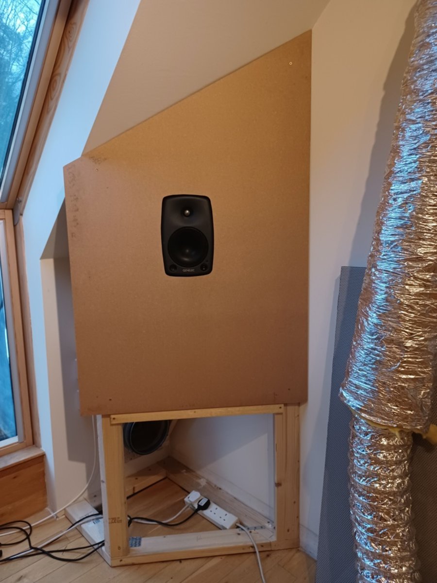 I covered the speaker box in 4mm of MLV, so surface density is now about 20 kg/m2, equivalent to the 30mm of MDF recommened in the Genelec flush mount instructions.