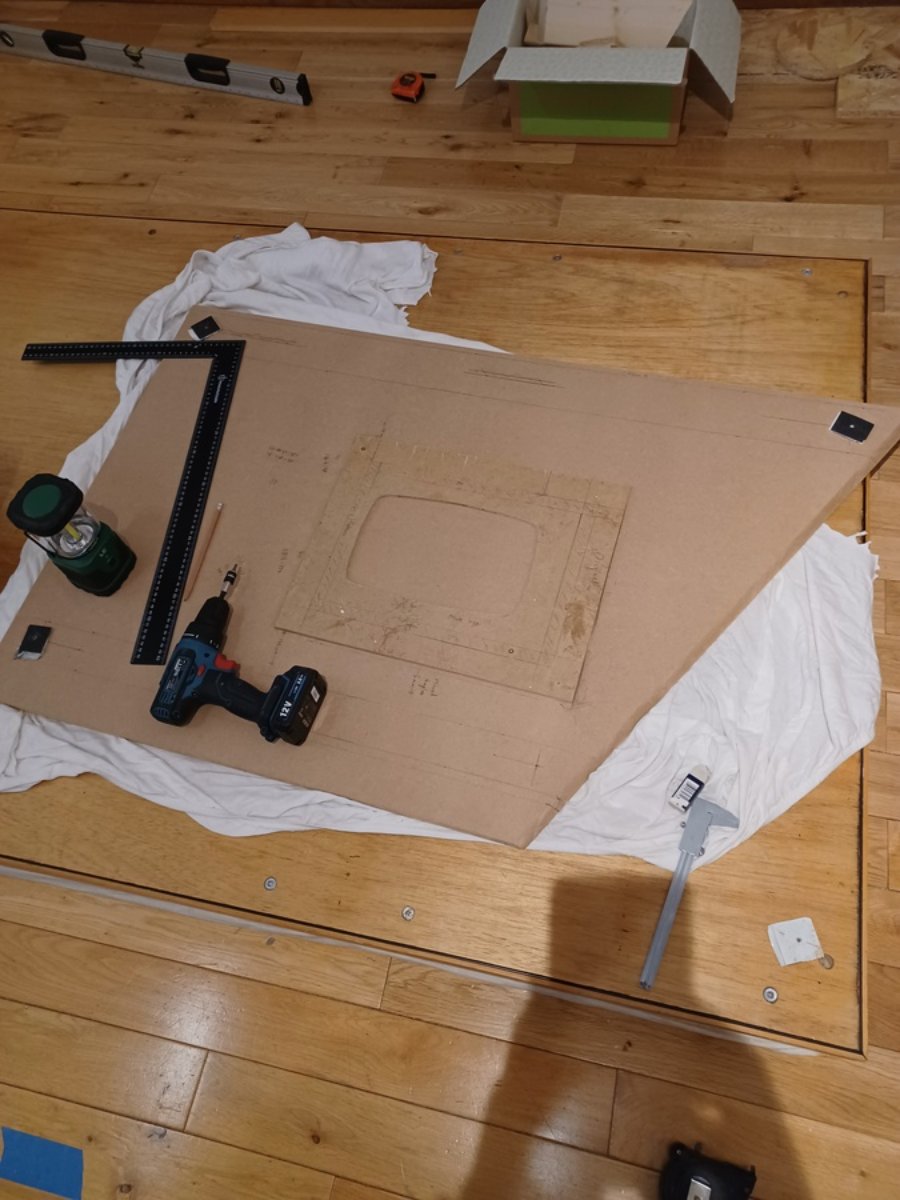 Remove the baffle from the soffit structure. The pencilled rectangle shows where the router template was. The black squares in each corner are pads of 4mm thick MLV, because that's what's going to be added under the whole baffle face.