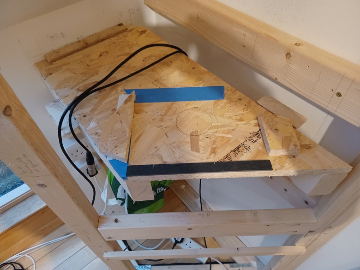 Transcribed a circle through the duct hole in the bottom of the speaker box onto the shelf. This is drilled out with the same holesaw to give perfect alignment.