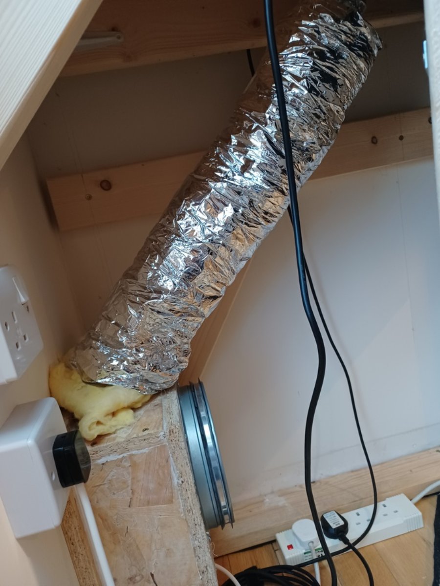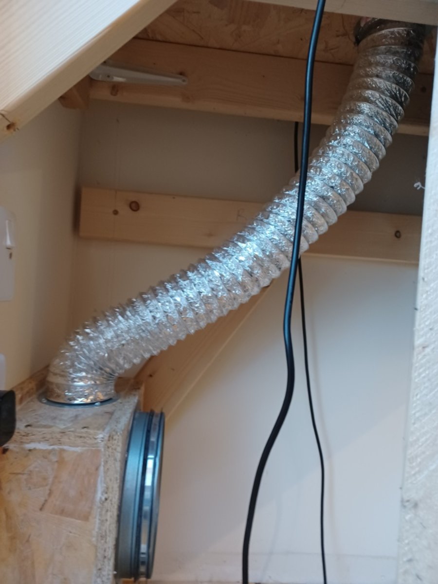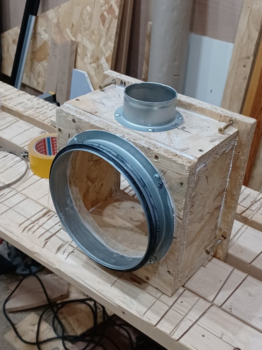 On to connecting up the ventilation for the speaker boxes with 80mm diameter acoustic flex flex duct. One end will be attached to the smaller flange on the top of the plenum. The room ventilation will be attached to the larger 200mm diameter flange.