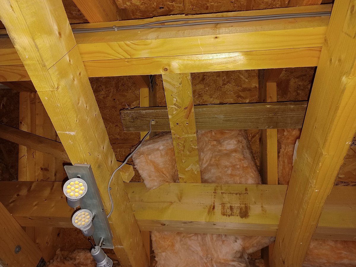 I phoned the electrician this morning, he said he'd arrive just after lunch so I had a busy morning ripping out the rest of the superfluous wood and building a new light cable nailer that runs above the inside out modules. I only just got it finished before he arrived! It's dark so can't get a decent photo, so will post some tomorrow.