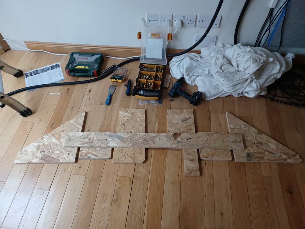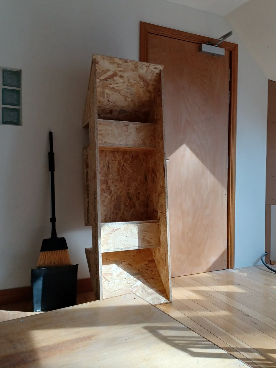 A partially built OSB part of the inside out module. The sloped ends and the cutouts round the beams will be properly covered for the final fit.