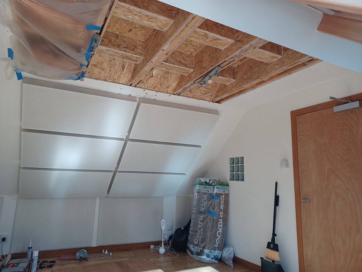 A quick ear test of sound transmission to the room across from this with reference tracks played at reference level revealed a slightly lower level of sound attenuation since replacing the flat plasterboard ceiling with the OSB modules. It's probably only a few decibels but worth investigating before adding the plasterboard layer to the modules.