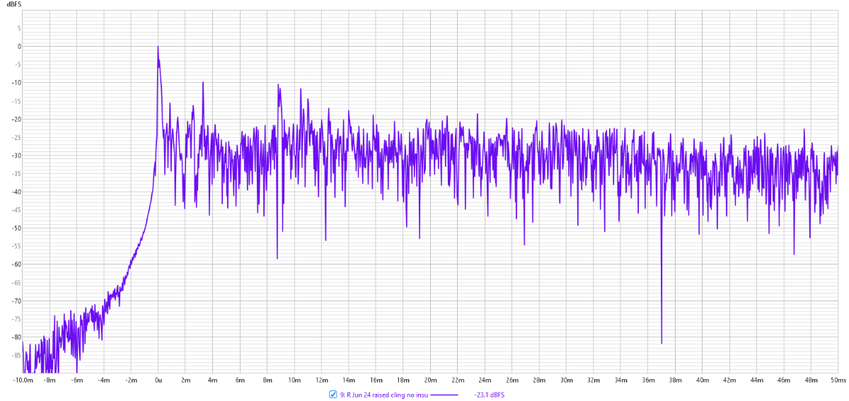 Next big problem to solve is the ETC peaks around 3 and 9ms. The 9ms peak correspdonds to a reflection from the speaker->far side wall->listener. That's resolved by placing a 100mm thick absorber on the door and equivalent position on the other side.