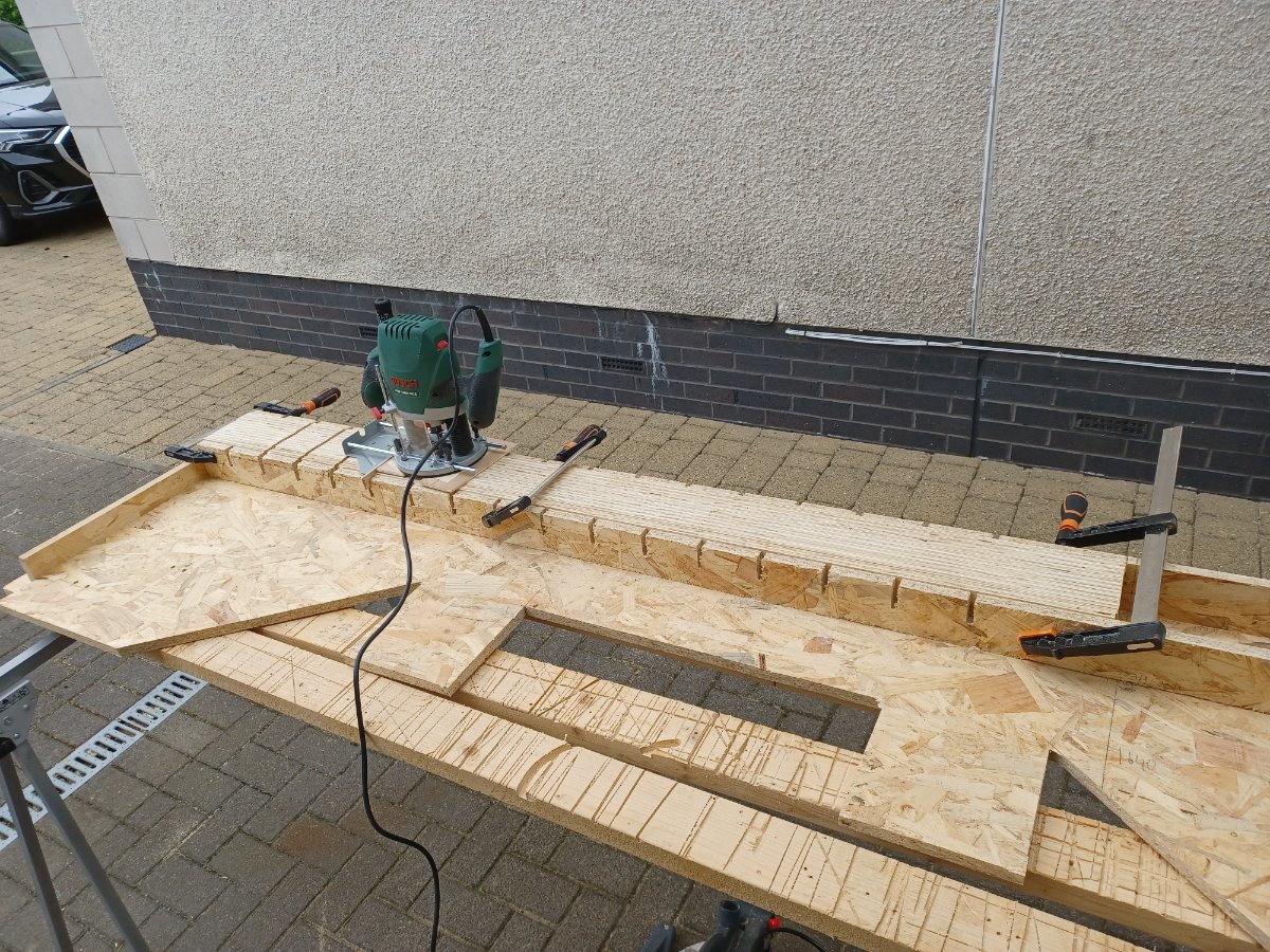 I made this jig from offcuts to allow routing of about 20 of the strips at the same time.