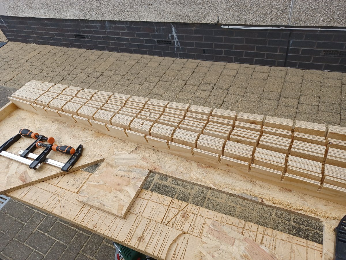 I ran the saw fence along the straight factory edge of the plywood sheet to cut the 76mm strips and get another straight edge, but of course slight saw variations from my cuts accumulated quite quickly after a few strips. Solved by making the next cut using the factory edge of another plywood sheet, but took a bit of time. My new circular saw has a better fence so that might be less of an issue next time.