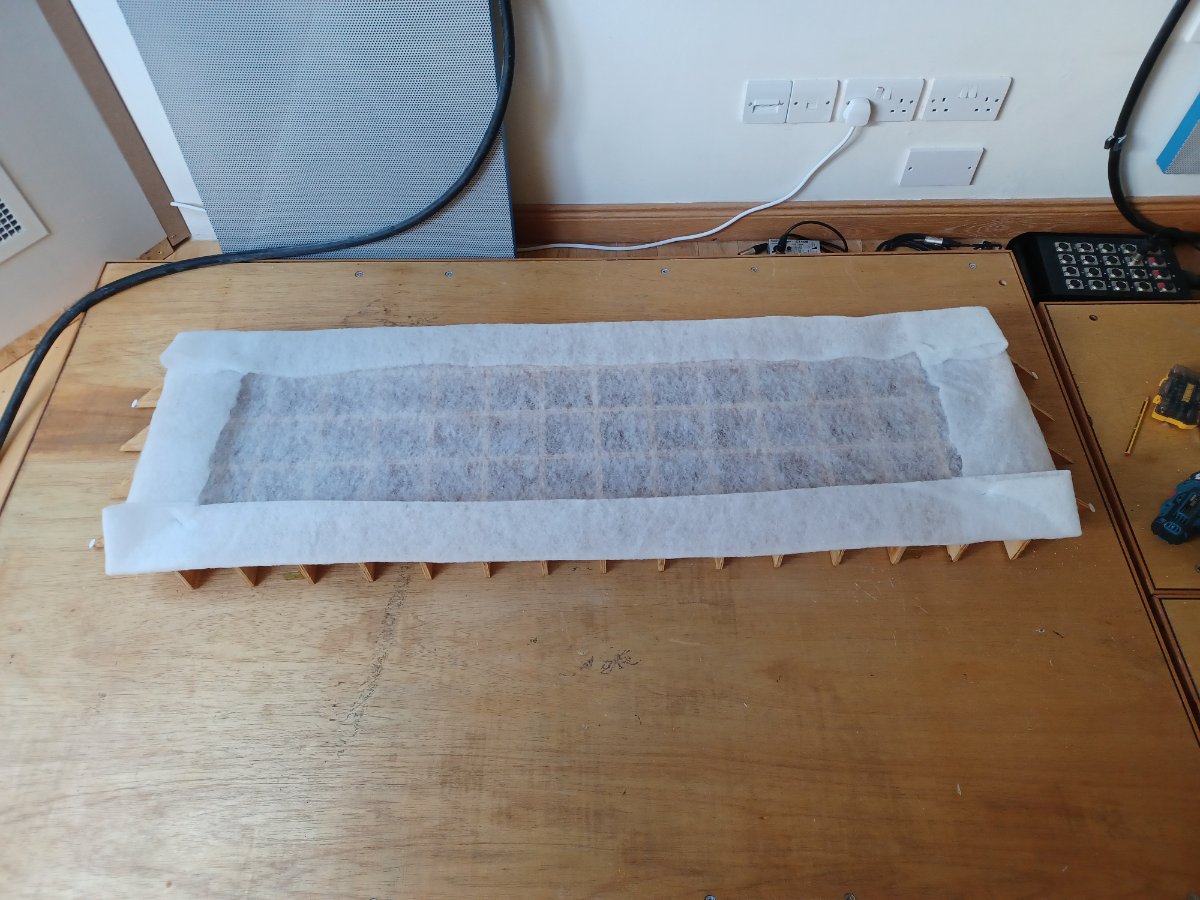 The second from left recess shows the fabric covered absorbers before the space coupler is added below them. The space coupler has wadding on top of it to give a diffuse covering and hide the "cushions stuffed into a corner" effect of these absorbers. The far left recess has the same fabric covered absorbers with wadding applied under them, rather than above the space coupler. I didn't use this method in the end because it was time consuming and awkward to apply and didn't work any better.