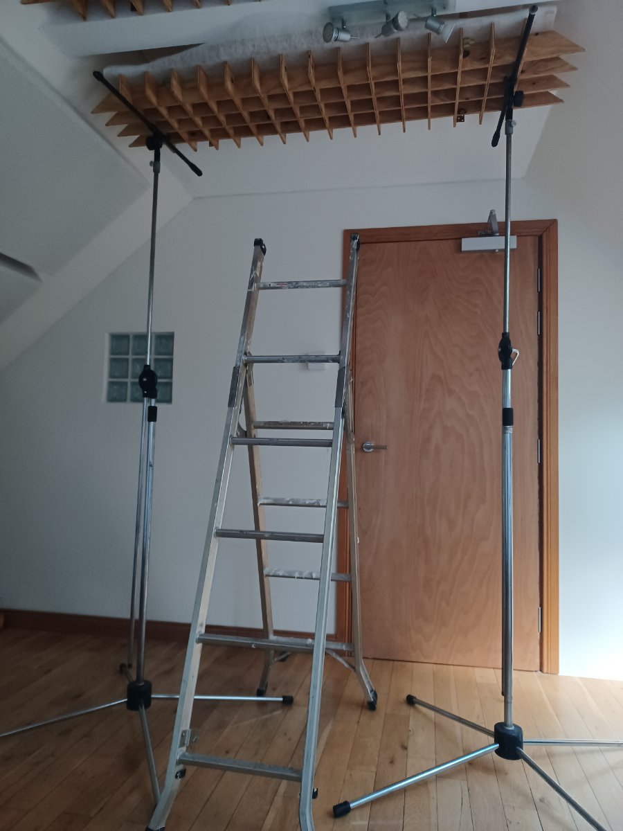 The very high orchestral mic stands hold the space couplers in place while I screw them into the ceiling.