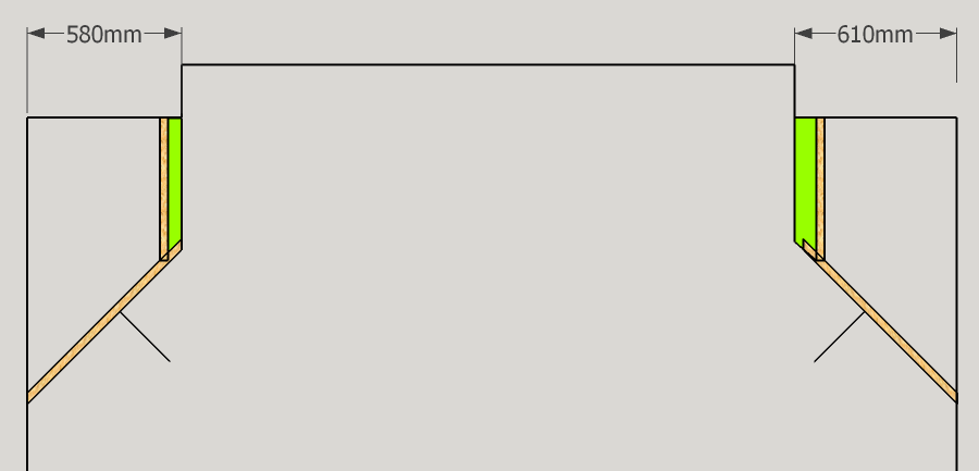 (2) Now the right wall is 30mm longer than the left but we keep the soffit faces identical. Here's one of my interpretations of your solution Stuart. Put a 30mm soft wing between the soffit and side wall. Right acoustic axis is now 30mm away further from the right side wall, and the acoustic centre of both speakers no longer lines up with the room centre line;