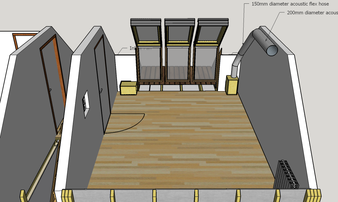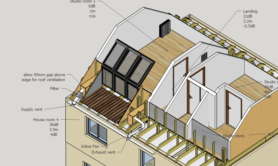 A. From studio to eaves, the isolation should be similar to that of the short wall i.e. two layers of 15mm drywall. So the silencer box walls should match this. Once in the eaves, the open soffit vents imply a ventilated deck, meaning not amazing isolation from there to outside. In number terms, the outside isolation to match is the large windowed expanse, which Velux claim is either 35 or 37 dB. Again, a single set of silencer boxes should do this. The inside isolation to match is 36 dB to the room below, and again a single set of silencers should suffice.