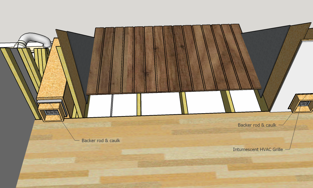 The sleeve for penetrating the room inner leaf has inside dimensions of 200x200mm giving 400 cm2 cross section. Caulk and backer rod will decouple the sleeve from the room inner leaf.